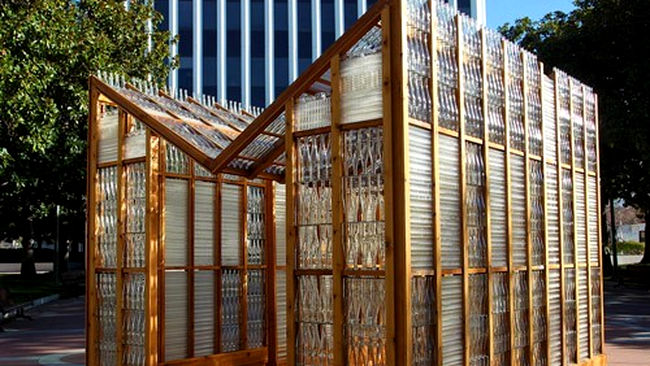 Deși căsuța din imagine este o operă de artă publică din Palo Alto, California, nimic nu te împiedică să-ti construiești propria ta căsuță. Recomandat este să nu golești tu toate sticlele, ci să le achiziționezi de la o cramă sau restaurant.