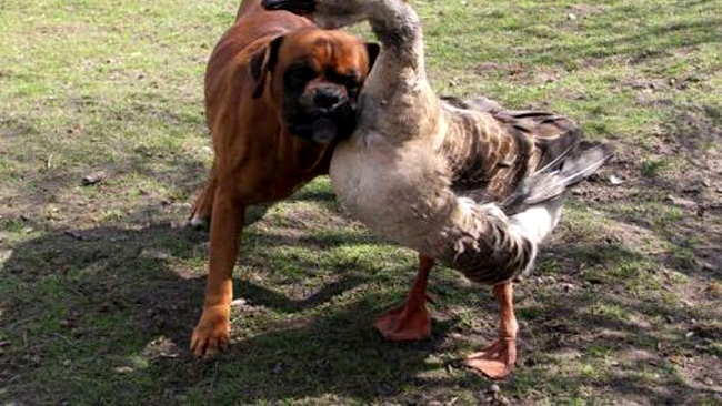 18) Baks, un boxer orb, are un prieten de nădejdie. Buttons, o gâscă de patru ani stă în per,anență cu el și în ghidează pe unde să meargă, fie stând lipită de gâtul său, fie „claxonând”.
