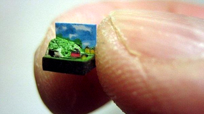 Micuța dioramă din imagine este impresionantă prin dimensiunile sale minuscule. Dacă mai ținem cont că înăuntru se află și o garnitură de tren cu cinci vagoane care face un circuit, nu putem decât să ne minunăm de măiestria autorului, David Smith.