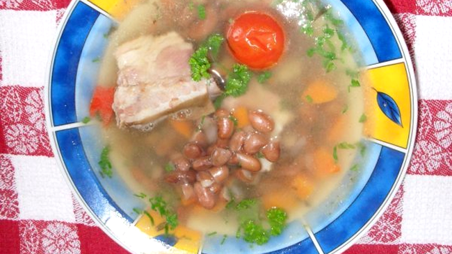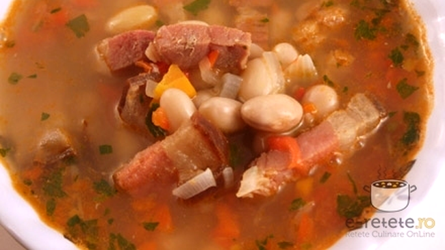 Pui ciolanul la fiert și când este gata (când se desprinde cu ușurință carnea de pe el) îl scoți din zeamă și cureți carnea de pe os, după care o tăi în bucăți mici. Osul îl dai la cățel, iar bucățelele de carne le vâri înapoi în zeamă. Cureți legumele sus-menționate (morcov, pătrunjel, păstârnac, ceapă) și le toci: zarzavaturile în bucățele foarte mici și ceapa peștișori. Scurgi fasolea și o pui la fiert în oala în care ai fiert ciolanul. După ce a fiert fasolea (când bobul este moale) calești legumele câteva minute că să-și dezvolte aroma și le adaugi și pe ele în oală. Tai slăninuță mărunt și o calești puțin după care o pui în oală. Pui bulionul. După ce au fiert și legumele (i.e. s-au înmuiat) adaugi roșiile tăiate cubulețe (dacă sunt așa cum am zis eu), sare, cimbru și mărarul tocat mărunt. O mai lași să fiarbă cam cât ține un Tom & Jerry, după care te apuci de treabă. Ai grijă pe parcursul acestei acțiuni să completezi cu ap[ dacă nivelul de lichid scade prea mult în recipient. Și merge la fel de bine și cu gogoșari sau castraveți murați.