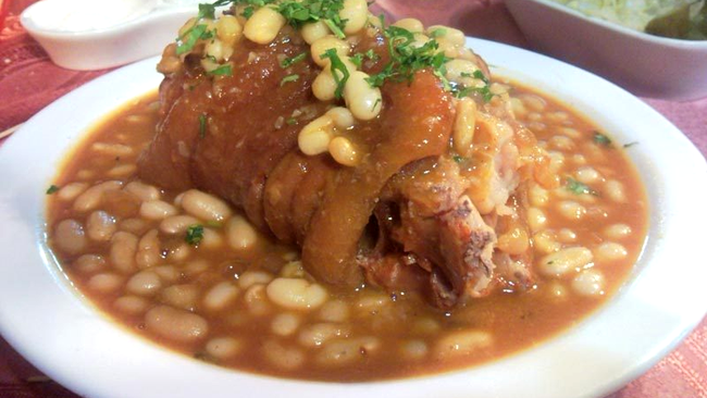 Se fierb în 2 litri de apă fasolea aleasă și spălată. Se scurge apa în care a fiert și se pun alți 2 l de apă fierbinte. Se repetă operația de două-trei ori. Carnea trebuie spălată bine și ținută în apă rece mai mult timp pentru a-i scoate sarea. Se pune, separat de fasole, carnea într-o oală cu apă pentru a da în câteva clocote, apoi se pune cu fasolea. Când sunt atât fasolea cât și carnea pe jumătate fierte se pun ceapa tăiată mărunt, morcovul și pătrunjelul, de asemenea tăiate mărunt. Se lasă să fiarbă, se pune sare, se acrește cu oțet și se tăie tarhon mărunt, cât într-o lingură, apoi se servește.