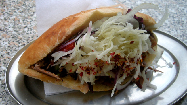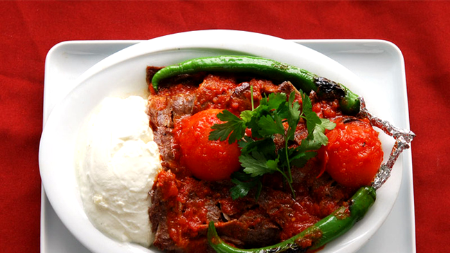 Ce este: Carne tăiată mărunt, așezată peste pită prăjită, totul stropit cu sos de roșii, acompaniat de puțin iaurt.