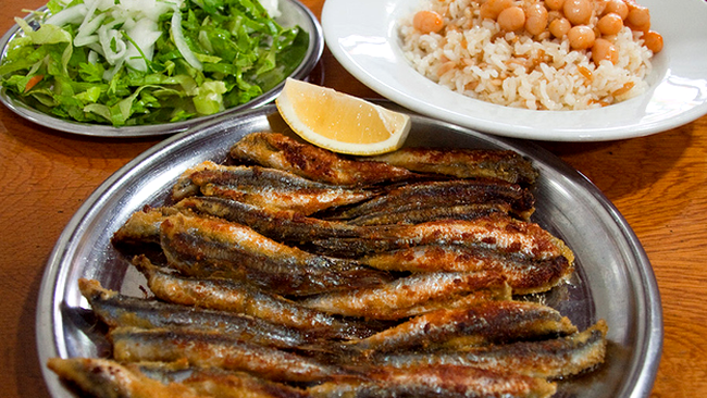Ce este: anșoa prăjit, servit împreună cu rucola și lămâie.