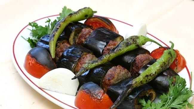 Ce este: carne de vită, roșii, ceapă, ardei iute și vinete, toate preparate la grătar sub formă de frigărui.