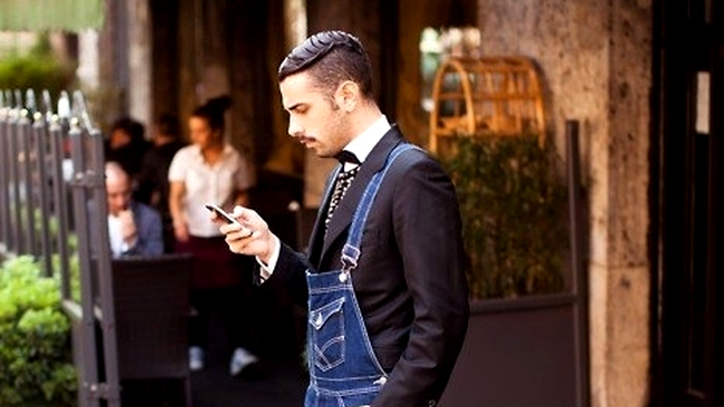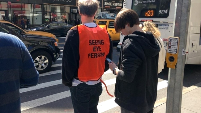 9. Un tânăr și-a atașat o persoană care să îl ghideze în timp ce el scrie SMS-uri mergând pe stradă.