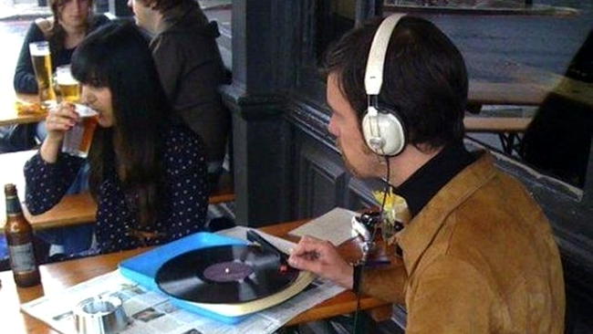 13. Un bărbat ascultă muzică pe vinil într-un bar din Londra.