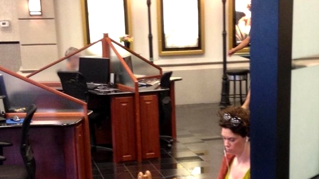 2. O femeie toarce un fus în sala de așteptare a unei reprezentanțe BMW