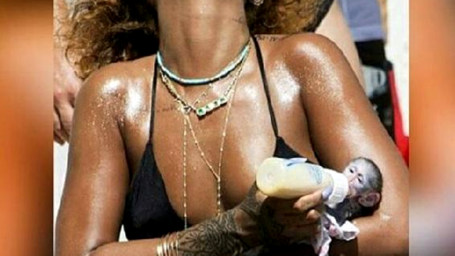 În afară de puiul de maimuţă, Rihanna a mai fost însoţită la plajă de două fete, angajate în mod special pentru a-i unge trupul de invidiat cu uleiuri de protecţie solară.