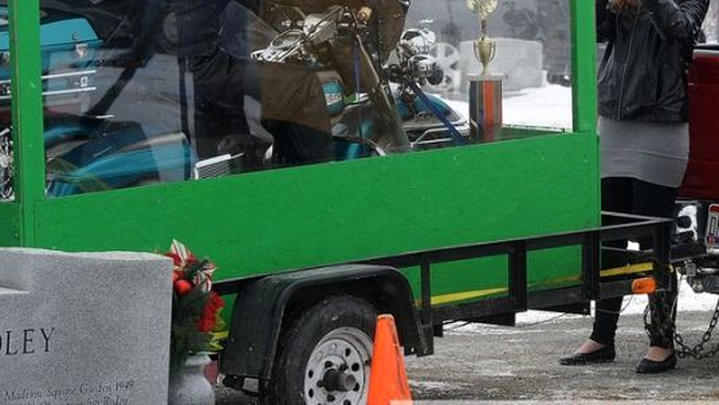 Fii motociclistului, Pete și Roy, au realizat un sicriu din plexiglas, cu podea din lemn și metal.