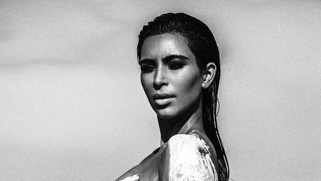 Imaginile sunt alb negru, iar Kim are pe corpul ei mai multe benzi de vopsea albă pentru a-şi acoperi zonele intime.