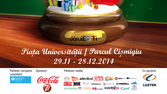 Vizitatorii interesați să se implice în Campania „Dăruiește, fii mai bun! Și tu poți fi Moș Crăciun….”, organizată de Primăria Municipiului București prin creart, în parteneriat cu Asociația SOS Satele Copiilor România, o pot face week-end-ul acesta între orele 11:00 – 20:00. Astfel, la căsuța SOS oamenii pot sprijini SOS Satele Copiilor România să ofere celor 240 de copii o familie unde aceștia cresc, se dezvoltă și se bucură de clipele frumoase ale copilăriei prin achiziționarea unei cărți de povești, „Vrajă, vis, Valentina și-un dichis”, iar la Casa lui Moș Crăciun pot face donații de cărți și jucării pentru copiii defavorizați, zilnic, până pe 26 decembrie 2014.