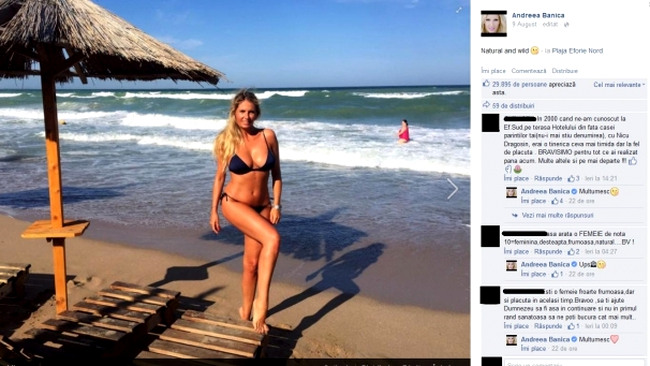 Pentru a face o poză pe FB, la care comentariul a fost „Natural and wild” (naturală şi sălbatică), Andreea Bănică a avut nevoie de două asistente, care să-i aranjeze costumul de baie, să o ungă cu ulei şi să-şi aranjeze părul.