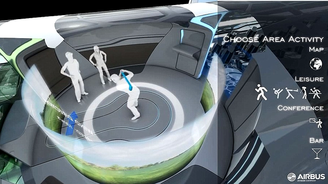 Un perete de cumpărături virtual va proiect haine direct asupra pasagerilor, iar peretele de jocuri virtuale va conține sporturi precum tenis, baseball și chiar și golf. Cei mai aventuroși pasageri, iubitori de sporturi extreme, vor putea accesa jocul Airbus Fusion Ball, care îi poartp pe zgârie-nori din New York sau pe vârfurile din Himalaya.