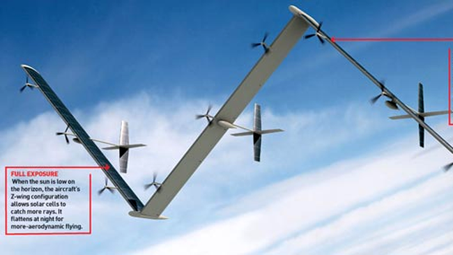 Avionul are forma literei "Z" pe parcursul zilei, ceea ce permite celulelor fotosensibile sa capteze lumina, iar noaptea acesta se deschide in forma de aripa si pluteste, economisind energie.