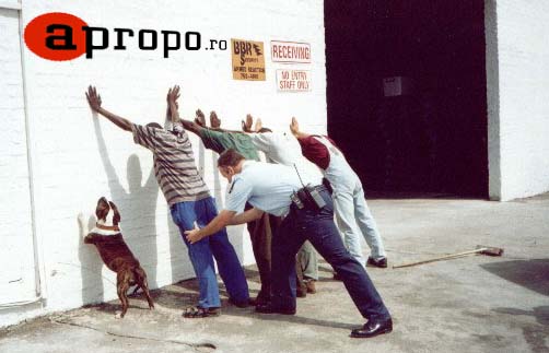 Hai, toata lumea cu spatele la mine, sprijiniti-va cu mainile de pereti, si sa n-aud comentarii. Ia sa vedem ce aveti prin buzunare – primul, o nimica toata, un pliculet de heroina, o cocaina mica…Tu, al doilea, ce e asta? Grenada defensiva, C4, trotil, mai copile, tu nu stii ca poate fi periculos sa ai asa ceva asupra ta? Tu – ranga, speraclu, cagula, ce dracului mai copii, cine va credeti? Voi imi treziti suspiciuni, parca ati fi fratii Marxx…dar cine e animalul asta atunci…si cainele asta, ce-i cu el, ce cauta aici?