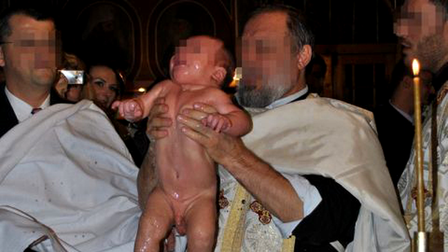 Dupa ce a fost scufundat de trei ori in cristelnita, cu capul in jos, un bebelus de doua luni si jumatate a inceput sa tremure cu convulsii.