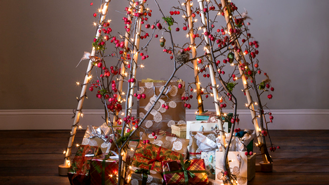 6. Aplică pe un suport (de exemplu o bucată de carton sau o cutie) diverse esențe de lemn, aranjate în forma clasică a bradului. Dacă ți se pare prea sărăcăcios, poți instala și luminițele.