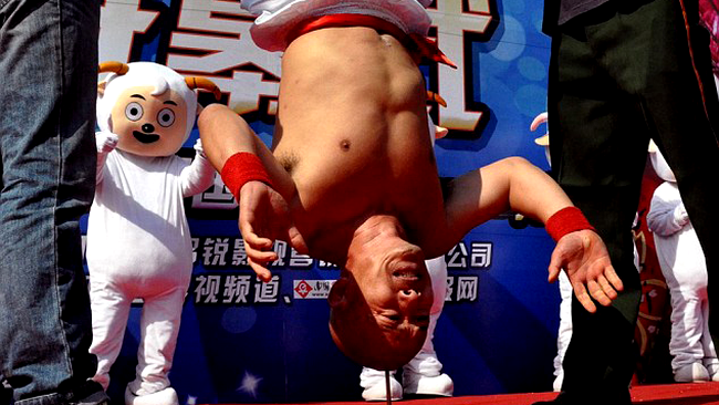 Cascadorie incredibila: Un chinez sta cu capul in jos, pe un cui!