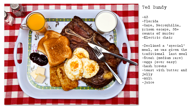 7. Ted Bundy – a refuzat o ultimă masă specială, mâncând una „tradițională”: friptură de porc, ouă, chiftele de cartofi, pâine prăjită cu unt și gem, lapte, ceai.