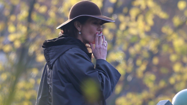 Fotografii au surprins-o pe actriţa în vârstă de 45 de ani în timp ce trăgea însetată dintr-o ţigară şi avea privirea orientată în gol.