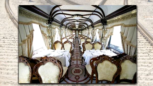 Decorul trenului Pullman include diamante, mozaicuri si lemn