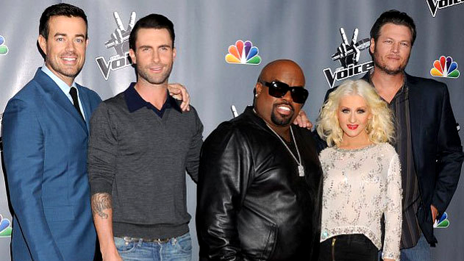 Artista în vârstă de 32 de ani, mamă a unui băiat, a apărut pe covorul roșu din Los Angeles alături de colegii ei de la „The Voice”, Blake Shelton, Adam Levine și Cee Lo Green.