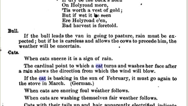 În cartea sa Weather Proverbs, locotenentul Dunwoody a documentat o lungă listă de credințe populare referitoare la prognoza meteo care se bazează pe studierea comportamentului unor animale, cum ar fi urșii, vulpile, caprele dar și pisicile.
