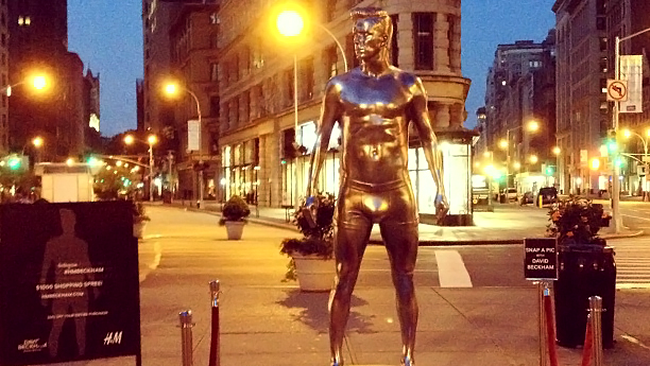 Statuile au fost văzute inițial în Londra, în luna februarie, ca simbol al primei colecții de lenjerie intimă lansate de Beckham pentru celebrul brand vestimentar.