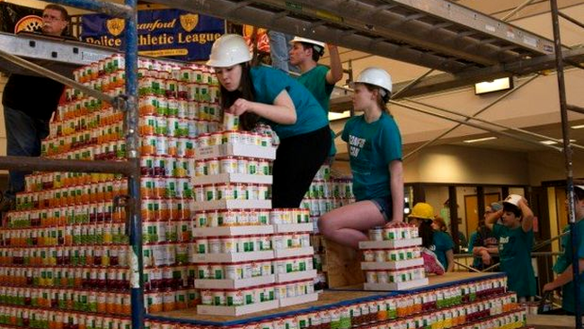 Piramida, care a fost construită pe 4 mai, va fi „demolată” azi iar conservele, 20.000 donate de ShopRite Partners In Caring iar restul colectate de grupul de tineri, vor fi trimise la trei centre de de caritate pentru a fi date ca ajutoare persoanelor aflate în dificultate.