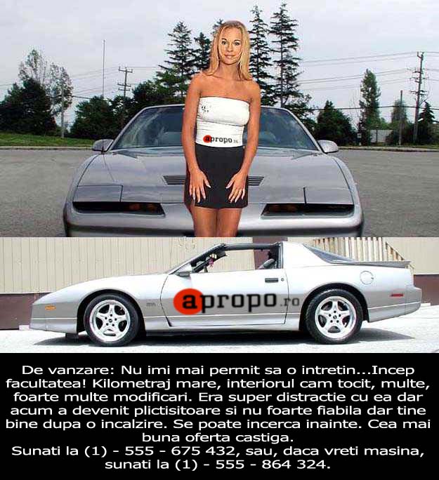 Daca vreodata va hotarati sa scapati de ea, daca nu stiti pe cineva, care s-o vrea, nu va ramane decat sa dati un anunt la micuta publicitate. Insa fiti foarte atenti la ce scrieti intrucat confuziile se creeaza cu o usurinta de neinchipuit. De ce spun asta? Pentru ca nici nu am spus ce anume doriti sa vindeti…(click pe poza pentru a intelege)./Razvan Rebegeanu