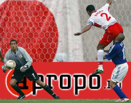 Interventie pe partea dreapta, sare la cap…pe cap…aoleu!. Celebrul jucator anonim din echipa adversa, s-a pus pe capul omului si nu-i mai da pace. S-au intalnit cazuri de nebunie crasa, in care anumite persoane se credeau diferite lucruri, insa asistam la primul caz de airbag uman – organic. Poate ca selectionerul ar trebui sa se gandeasca la patentarea acestui nou produs, si sa-l prezinte unei firme producatoare de asemenea sisteme de securitate, care, daca vor adopta noua tehnologie, te vor trata dupa cum se vede si in imagine./Razvan Rebegeanu