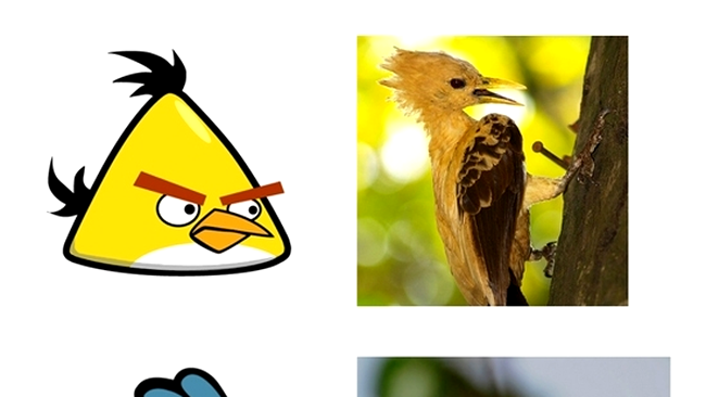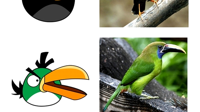 Pasarea neagra care explodeaza este copiata dupa Myna (Acridotheres tristis), in timp ce pasarea bumerang pare sa fie copia leita a Tucanului de smarald (Aulacorhynchus prasinus).