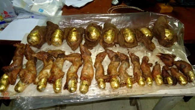 Drogurile fuseseră înfășurate în staniol, sub forma unor pachete asemănătoare ouălor, și îndesate în pui întregi prăjiți.