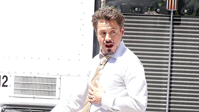 Robert Downey Jr. a fost fotografiat pe platoul de filmare la "Iron Man 2" purtand pantofi cu tocuri.