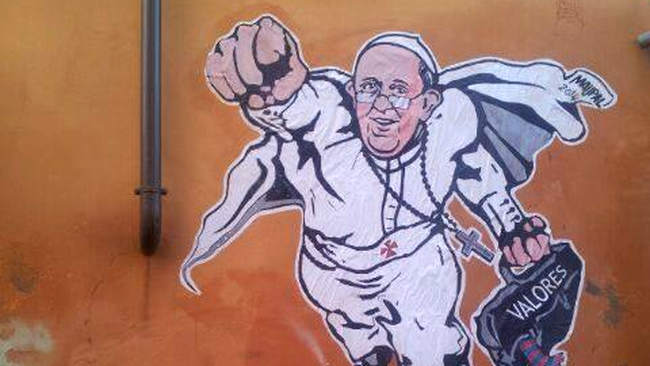 Imaginea prezintă pe Papă în zbor, în celebra postură a lui Superman, cu pumnul înainte, ținând în cealaltă mână o servietă pe care scrie în spaniolă „Valores” (valori, în sensul de valori etice).
