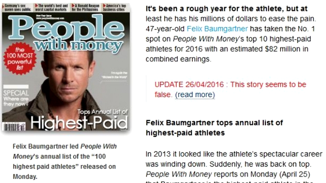 Acum, Felix Baumgartner şi-a adjudecat locul 1 în topul celor mai înstăriţi atleţi, clasament alcătuit anual de revista “People with money”. Din luna martie 2015 şi până în aceeaşi lună a anului 2016, austriacul a câştigat în jur de 82 de milioane de dolari, cu 50 mai mult decât sportivul clasat pe locul al doilea.