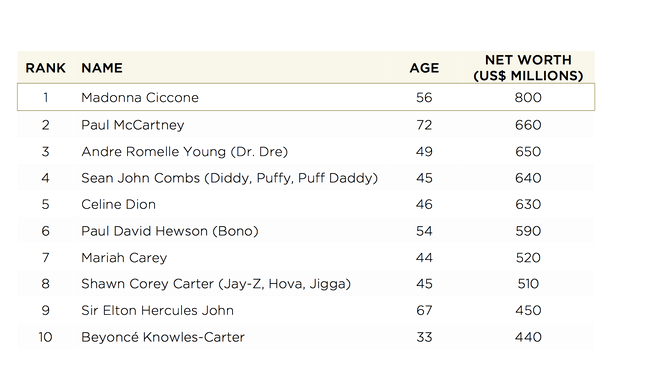 Cu o contribuţie semnificativă încă din anii 1980, Madonna a reuşit performanţa de a se păstra în atenţia publicului timp de mai bine de 30 de ani. Fie prin controverse, fie prin muzică sau chiar ca autoare a unor cărţi pentru copii, ea a acumulat o avere de 800 milioane de dolari, fapt care o clasează pe primul loc al celor mai bogaţi artişti.