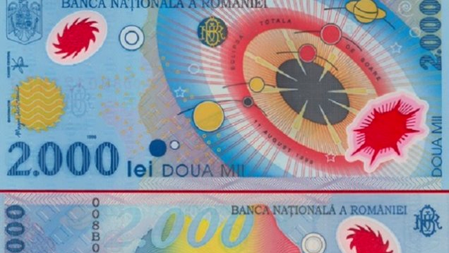 La 2 august 1999, pentru comemorarea Eclipsei totale de Soare din 11 august 1999, Banca Naţională a României a emis o bancnotă din polimeri cu valoarea nominală de 2.000 de lei, aceasta fiind prima bancnotă din polimeri emisă de România şi totodată prima bancnotă din polimeri emisă în Europa.