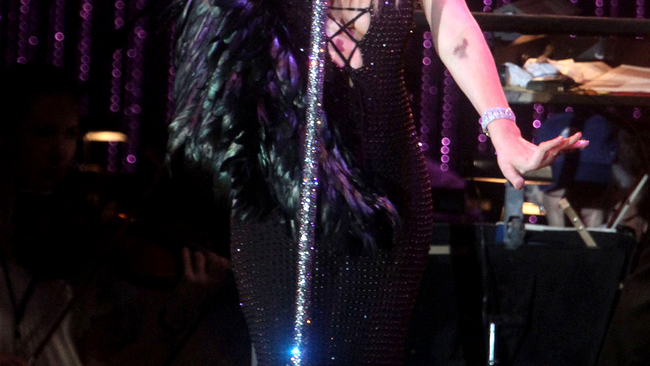 Cântăreaţa şi-a pregătit două ţinute de scenă, pe care le-a asortat perfect cu bandajul special pe care trebuie să-l poarte. Astfel, artista a purtat o husă cu cristale Swarovski pe care a asortat-o la o rochie albă, încrustată cu acelaşi tip de cristale, dar şi o husă din pene care s-a potrivit de minune cu rochia neagră pe care a purtat-o.