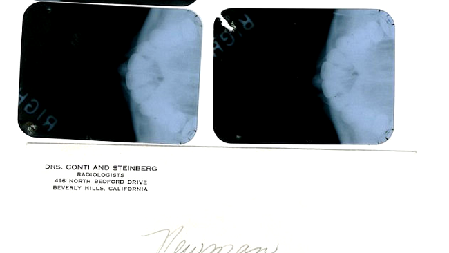 Radiografiile ei sunt datate „7 iunie 1962”, când Marilyn Monroe și-a vizitat medicul pentru control după ce într-o noapte căzuse pe scări. După două luni de la vizită actrița a murit, la 36 de ani, în urma unei supradoze de barbiturice. Marilyn și-a făcut și o rinoplastie pentru a-și corecta vârful nasului, dar a folosit pseudonimul Joan Newman pentru a fi înregistrată în documentele medicale.