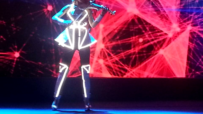 Artista a urcat pe scenă purtând un costum inovator care, prin comandă bluetooth, se aprinde şi luminează în întuneric, putând oferi chiar şi jocuri de lumini spectaculoase.