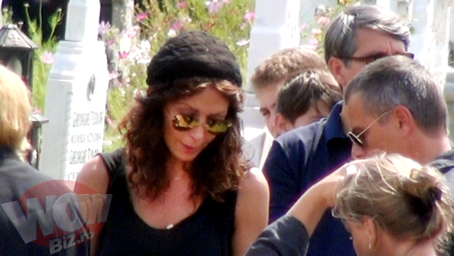 Îmbrăcată în pantaloni negri şi o bluză de voal, Mihaela a înlocuit clasica broboadă neagră de doliu cu o eşarfă pe care şi-a prins-o peste şuviţele vopsite, lăsate pe spate.