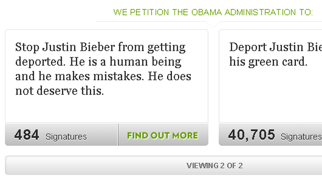 „Am dori ca nesăbuitul, periculosul, distructivul Justin Bieber, care abuzează de droguri, să fie deportat și deposedat de permisul de ședere. El nu numai că amenință securitatea cetățenilor noștri, dar are o influență dăunătoare asupra tinerilor”, se menționează în petiția postată pe secțiunea dedicată petițiilor pe site-ul Casei Albe.