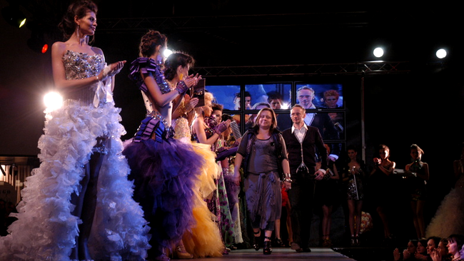 defilat si ea intr-o rochie cu multe pliuri si cristale Swarovski,