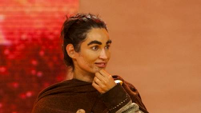 Cheală, cu sprâncene mari, stufoase şi grizonate, cu tenul ridat şi îmbătrânit arată horror. Dacă te uiţi la cea de-a doua poză realizezi că are şi barbă lungă, poartă haine de motor şi e de fapt, bărbat.