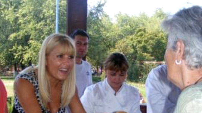 Cireasa de pe tort a fost pusa pe 4 octombrie, la “Zilele toamnei 2008”, cand, imbracata intr-un deux-piéces negru, cu pantofi lacuiti si un Hermes asortat la topul alb cu argintiu, Elena Udrea a impartit tinerilor adunati cu mic, cu mare la spectacol, tricouri albe pe care erau imprimate (cu portocaliu, bineinteles) retete de muraturi. Intre doua momente artistice, blonda de la Cotroceni s-a inarmat cu borcane cu castraveciori murati si plase cu gogonele pe care le-a impartit pensionarilor. Cu nepoti in brate si cu tricoul primit cadou, luat peste hainele groase, cei mai putin norocosi dintre ei se tineau scai de Udrea pentru o sacosa cu “bunatati”. Zambitoare si extrem de amabila, Elena a tras cateva sfori si le-a adus amatorilor de pomeni electorale cate o plasa cu biscuiti si muraturi. Din cale-afara de multumiti, oamenii ii pupau mainile si faceau plecaciuni, fericiti din cale-afara ca pedelista i-a bagat in seama.