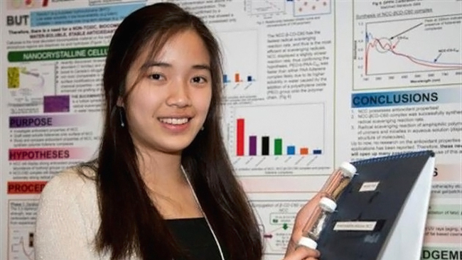 Janelle Tam, elevă la un liceu din orașul Waterloo, Ontario, a creat substanța antioxidantă din nanoparticule prezente în fibra lemnoasă.
