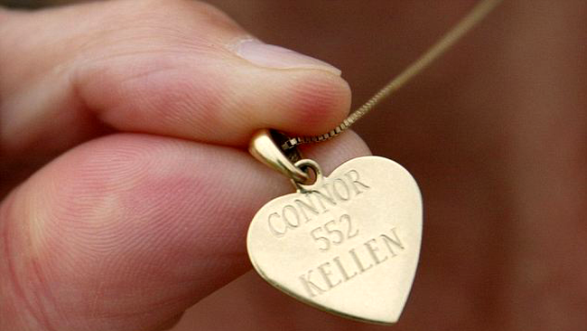 Ei poartă la gât medalioane în formă de inimă inscripționate cu numele celor doi bărbați și cu cifra 552, reprezentând numărul transplantului de inimă realizat la spitalul în care a avut loc interveniția.