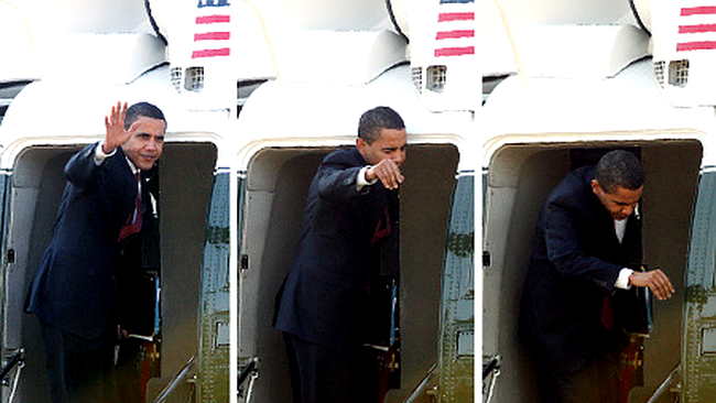 Greseala a fost reeditata si de actualul presedinte, Barack Obama, care, pe scara elicopterului, s-a intors sa salute, iar cand a vrut sa intre in elicopter, s-a lovit la cap.