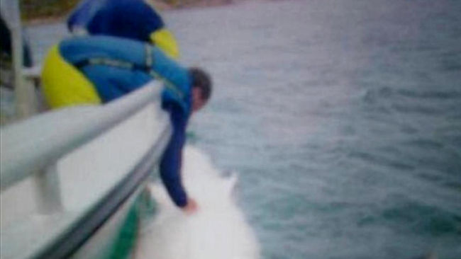Joan the Shark, în timpul procedurii de montare a sistemului de monitorizare